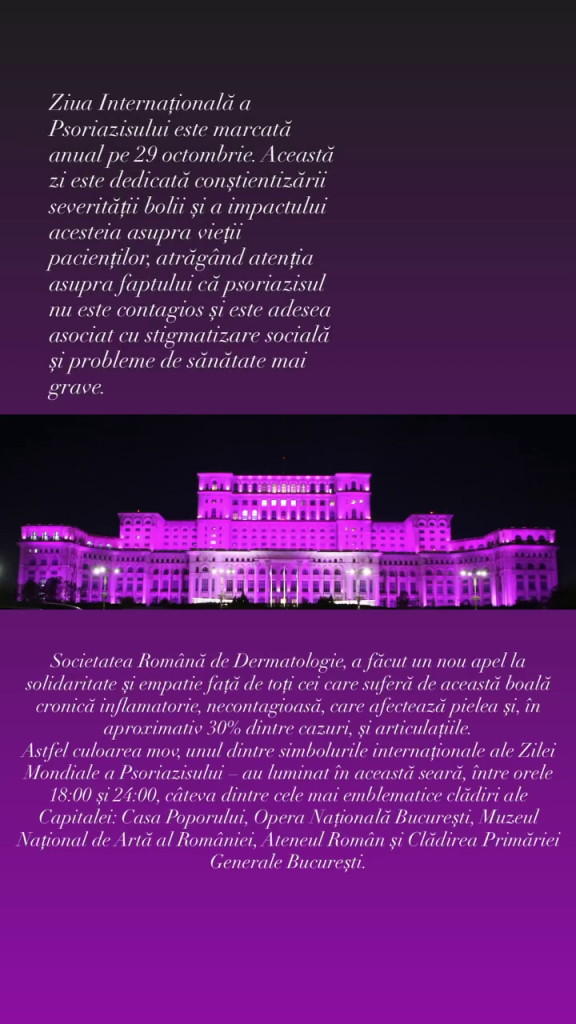 Culorile mov și portocaliu – simboluri internaționale ale Zilei Mondiale a Psoriazisului – vor lumina în această seară, între orele 18:00 și 24:00, câteva dintre cele mai emblematice clădiri ale Capitalei: Casa Poporului, Opera Națională București, Muzeul Național de Artă al României și Clădirea Primăriei Capitalei.